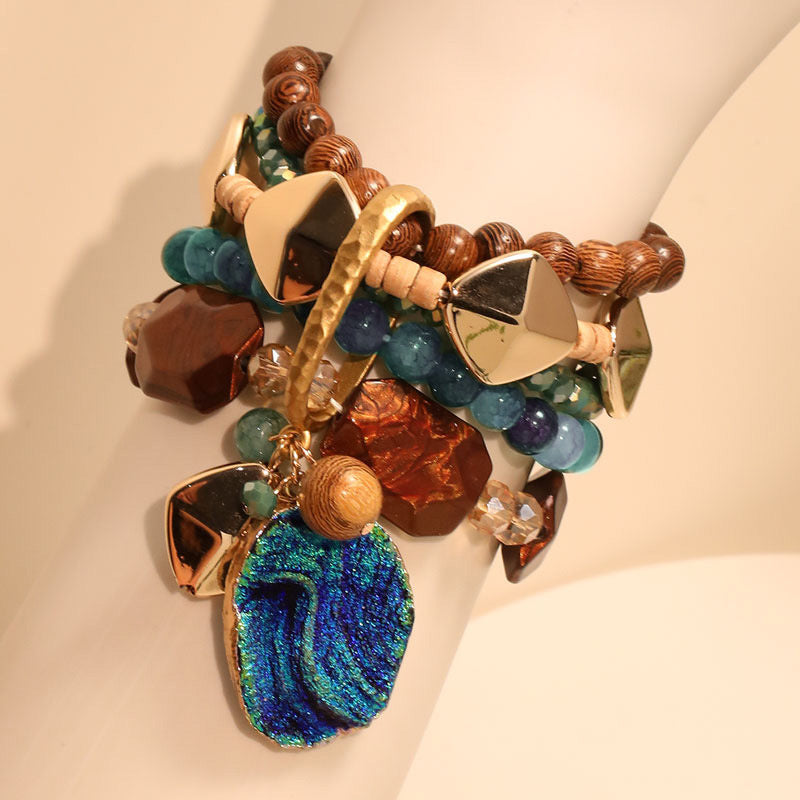 Mixed-Material Layers: A tactile blend of wood, crystal, glass, and metal beads for rich texture and depth.